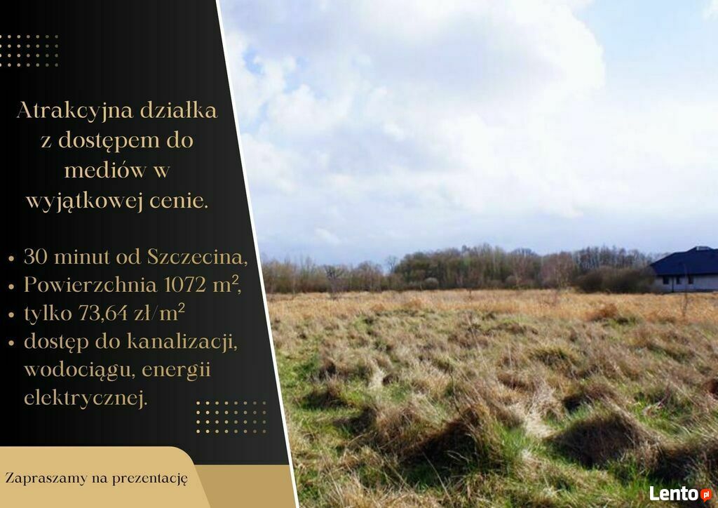 Działka o pow. 1073 m2, położona jest w (oddalonej ok. 6 km odcentrum Goleniowa) prężnie rozbudowującej się miejscowości.